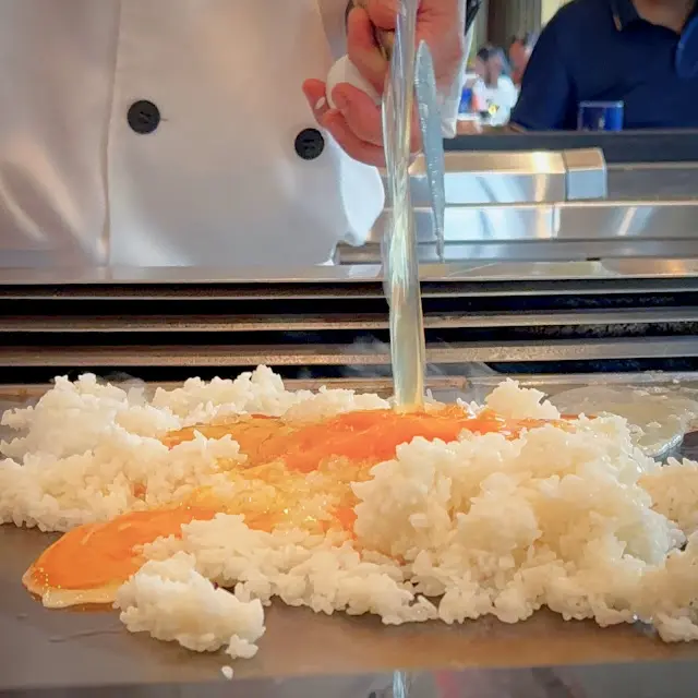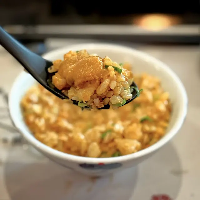 每次吃鐵板燒也很喜歡欣賞由零開始炒到香噴噴的炒飯,因為眼睛跟鼻子也會非常享受,這次我們得到的是雲丹炒飯。
