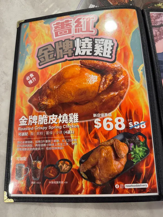 金牌脆皮燒雞,Keep 到灣仔店水準 lulu_1437等级22025-01-056K 浏览 关注 今天大約下午二時半吃下午茶,我們兩大兩小,叫了兩份燒雞和薯條。當時門口有少量客人排隊,等約5分鐘後有位。店面自助售賣機購買,類似麥當勞使用的售賣機,取得號碼入店等候,然後自己取燒雞,可用八達通信用卡付款。在店內等候約5分鐘燒雞完成。店舖座位乾淨,可自動添醬汁,提供手套濕紙巾。燒雞賣相吸引,外脆內嫩多汁,可自己添加咸度,有華鹽和泰式甜醬。套餐可選薯條,茄汁意粉或飯。基本上成人食完成隻雞都會好飽。唯獨飲嘢熱飲加$8,凍飲$13 。有點貴。剛開業特價$68原價88,聽說特價只做一個月  燒雞好多雞汁雞皮好脆,味道一流。 $6816453以上食记乃用户个人意见 , 并不代表OpenRice之观点。赞好分享金牌脆皮燒雞,Keep 到灣仔店水準 薔紅宅急便 https://s.openrice.com/QrLT044vP00检举 张贴 评分5味道5环境5服务5卫生5抵食推介美食金牌脆皮燒雞$68用餐日期2025-01-05等候时间5 分钟 (堂食)人均消费$50 (下午茶)