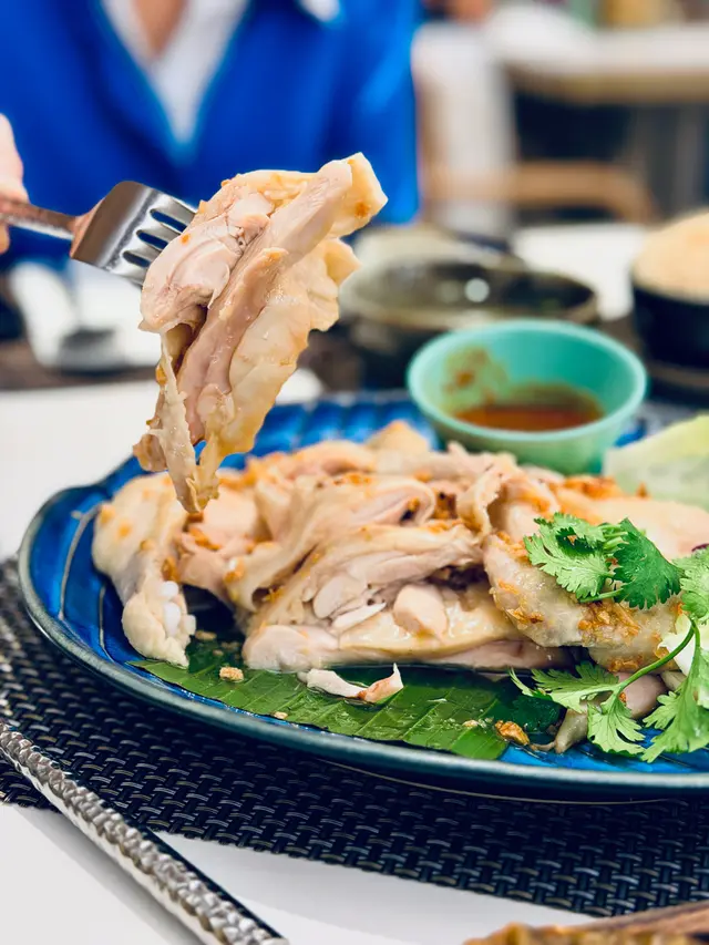 招牌海南雞飯選用無骨雞隻烹製,雞皮薄得來脂肪低,肉質嫩滑多汁,入口細膩,並配以秘製泰式沾醬,散發著濃郁的香料氣息。雞油飯以橄欖油煮成,粒粒分明散發油香,而雞湯椰以青水煮成,味道清甜。