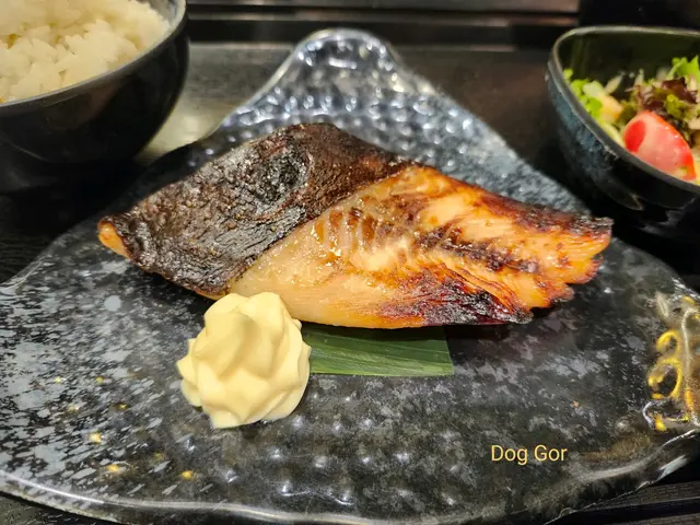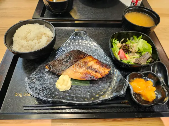 銀鱈魚西京燒定食 (前菜、味噌湯、沙律、主食、米飯) : 銀鱈魚冇骨又夠厚肉,燒得夠火喉夠香口,味道鹹香且惹味 , 魚皮烤得夠脆 , 魚肉又有肉汁又嫩滑,而且又不失甜麵豉醬的味,還有Q韌彈牙的米飯,真樂透 ~
