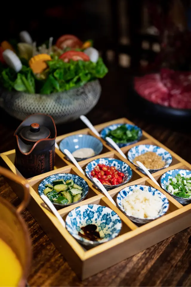 雞湯底最適合配襯各類不同的蔬菜。特性蔬菜拼盤,齊集很多不同種類的素菜。一整盤色彩繽紛的蔬菜,排得整整齊齊甚有美感。