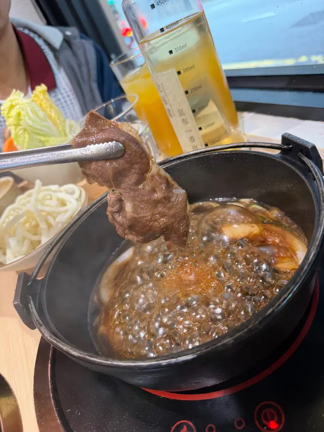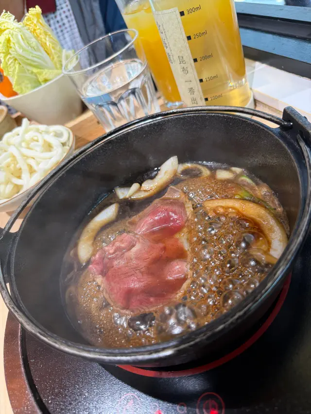關東風醬油基底甜鹹適中⚱️ 加入高湯,配上和牛肉,煮熟後蘸蘭王蛋液,有得自己煮好好玩又好食😋😋