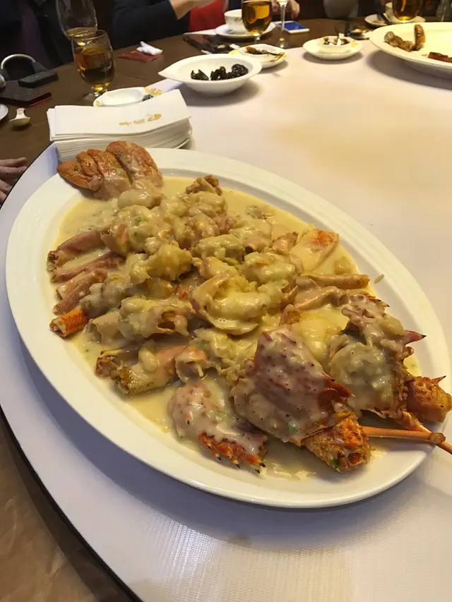 等了一會終於上菜,先來芝士龍蝦伊麵,一上菜即時被其氣勢震攝,不禁拿起手機出來拍一拍!龍蝦大得很誇張,每人可分到三至四件,肉質爽彈極有鮮味,應該是新鮮澳洲龍蝦。