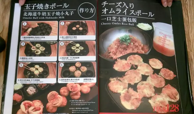 北海道牛奶玉子燒小丸子,$128可選自選兩款配料,我們揀了青蔥和明太子。玉子燒小丸子,顧名思意,不同於另一款招牌菜傳統章魚燒,玉子一定要煎得嫩滑,如果唔係就失去食玉子燒的意義了。而製作流程亦差不多,只是不能先開火,而是要先放油再倒入蛋漿至七成滿,牛奶蛋漿的份量剛好足夠製成12粒小丸子。之後放入明太子和青蔥,準備就緒才開火,大致成形之後反轉再加入蛋漿, 輕輕煎熟了便要即時取起,以免過熟失去嫩滑口感。脹卜卜的玉子燒可再加上沙律醬、木魚及紫菜碎,內裡明太子的鹹味與淡淡甜香的玉子出奇地匹配,加上青蔥的清香,滑嫩鹹香齊備,是章魚燒以外另一必試菜式。