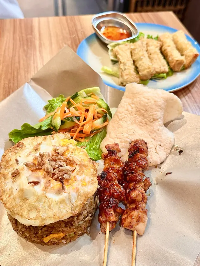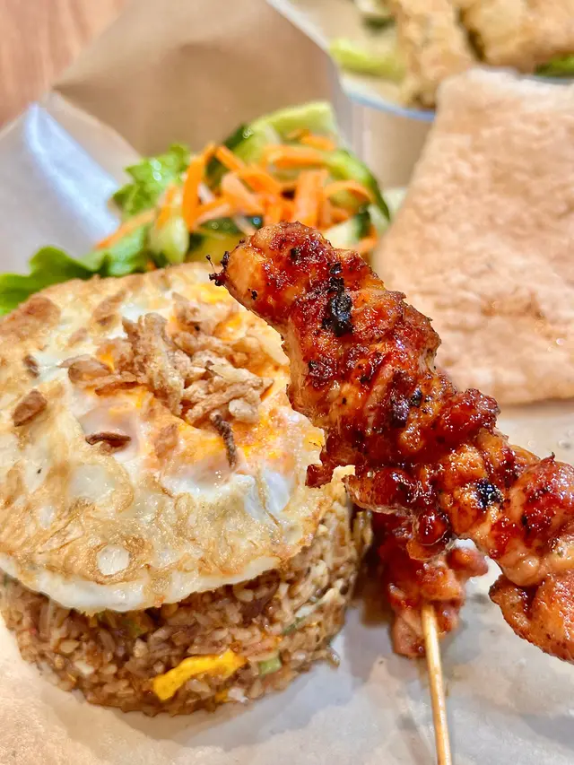 印尼炒飯🔥👉🏻飯底濕潤適中,炒得好有鑊氣🔥,裏面好多唔同嘅配料食落口感層次豐富😉,兩串串燒火候燒得啱啱好👌🏻,調味都好有印尼風味🧂