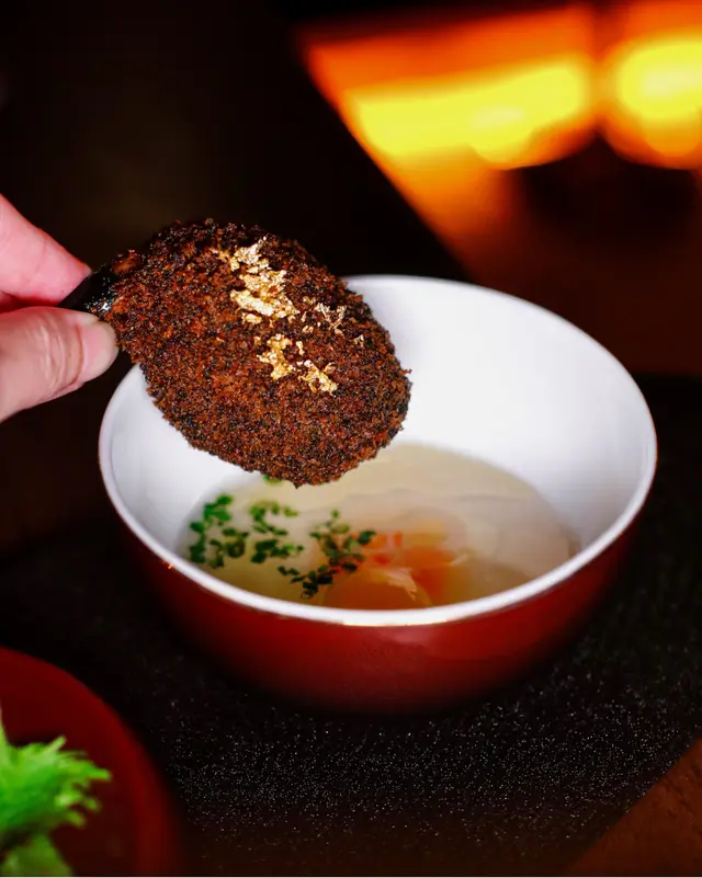以魚乾脆片夾住鮟鱇魚肝