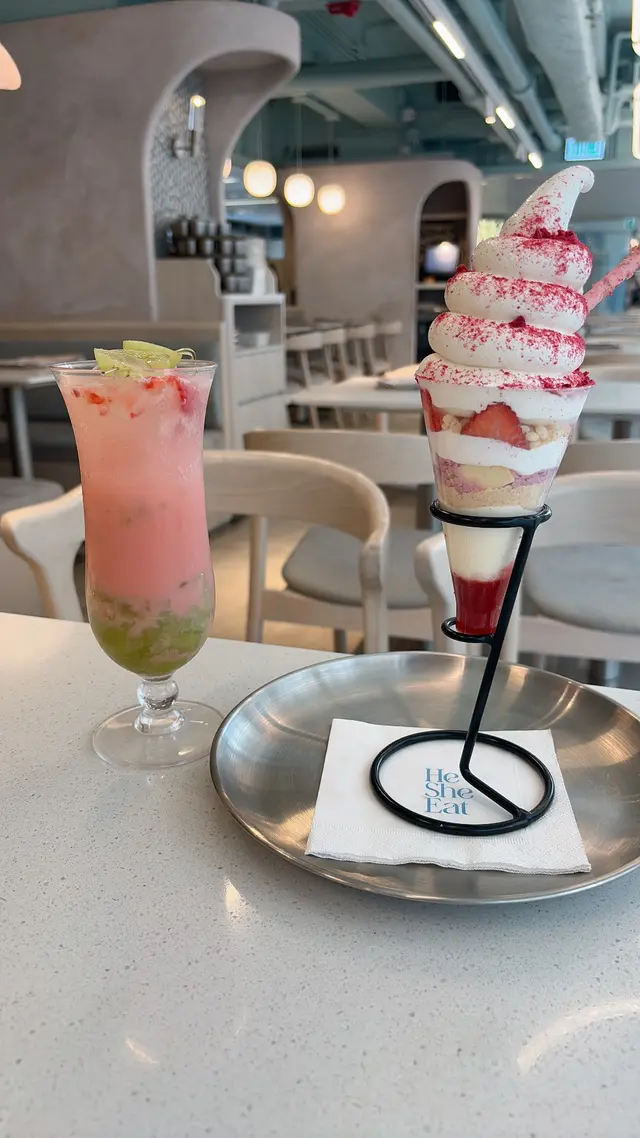 雲朵般輕盈的自家製芝士慕斯,夾著脆脆的餅乾條。一勺挖到底,冰涼的5.0牛乳雪糕裹著草莓果肉,酸爽果香瞬間喚醒味蕾,是少女心爆棚的甜蜜暴擊!
