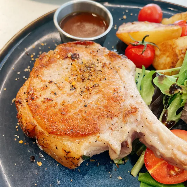 厚切豬鞍扒外層煎出金黃格紋,刀尖劃開時肉汁緩緩溢出。加拿大豬特有的甘甜在口中漫開,肉質彈嫩得驚艷,襯著焦糖化的蜜糖薯角,鹹甜交織出北國風情。最驚喜是底層鋪著焦糖洋蔥,甜味溫柔裹住味蕾。