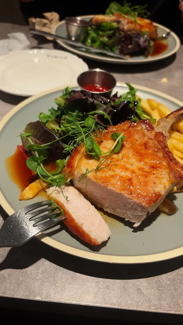 先講講食物! 我哋叫咗佢哋嘅招牌菜—燒豬鞍同埋百里香檸檬煮日本蜆。先嚟個主角—燒豬鞍! 賣相一流, 金黃色嘅豬鞍皮, 香脆可口, 肉質鮮嫩多汁,配上香濃嘅醬汁同埋薯條, 簡直係完美組合! 😋 不過, 可能因為我哋嘅要求比較高, 覺得豬鞍略嫌乾了一點, 但整體味道依然不錯!