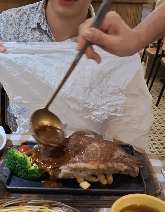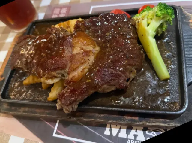 ▪️鐵板西冷牛扒(黑椒汁):戲肉嚟啦!職員即場淋上熱辣辣黑椒汁,滋滋聲伴隨香氣撲鼻,儀式感十足!牛扒叫咗七成熟,切開仲保持粉嫩,肉質鮮嫩有嚼勁,份量大到朋友都嚇親。