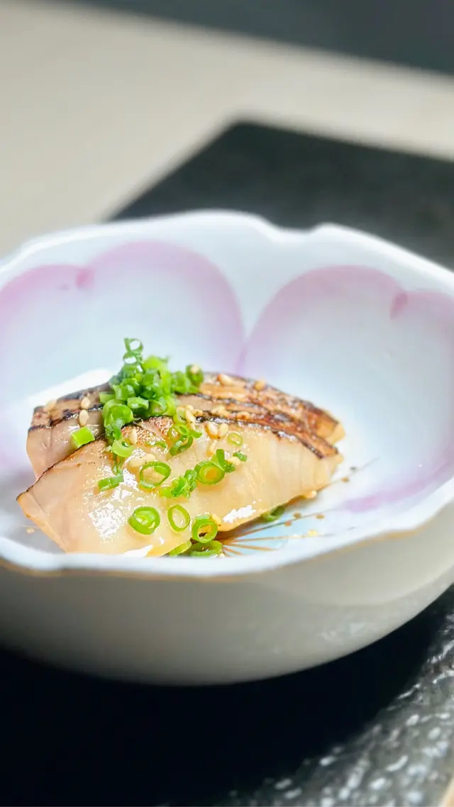 醬油漬的銀鱈魚,再輕輕火炙,再以芝麻及蔥增加風味,味道層次豐富。