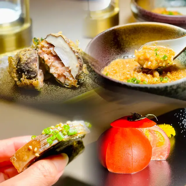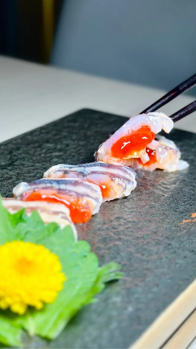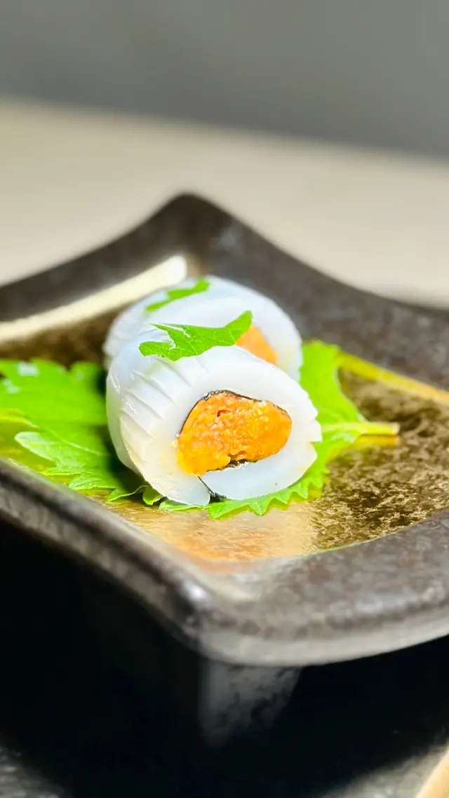 魷魚刺身卷住赤海膽,海膽鮮甜不帶腥味,給舌頭細膩享受。