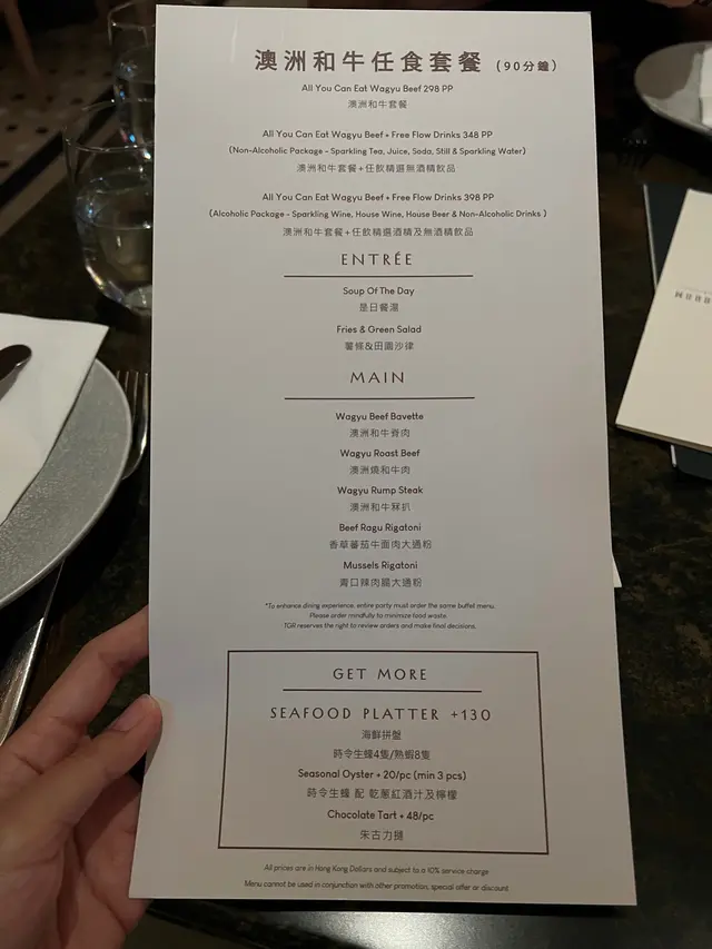 ⭐️澳洲和牛任食套餐(90分鐘),有三種不同的選擇。今次我係食澳洲和牛套餐($298一位)。呢個套餐包括有是日餐湯,薯條&田園沙律,澳洲和牛脊肉,澳洲燒和牛肉,澳洲和牛冧扒,香草蕃茄牛面肉大通粉,青口辣肉腸大通粉。食物食完可以再添。和牛每次order, 係每款兩件。