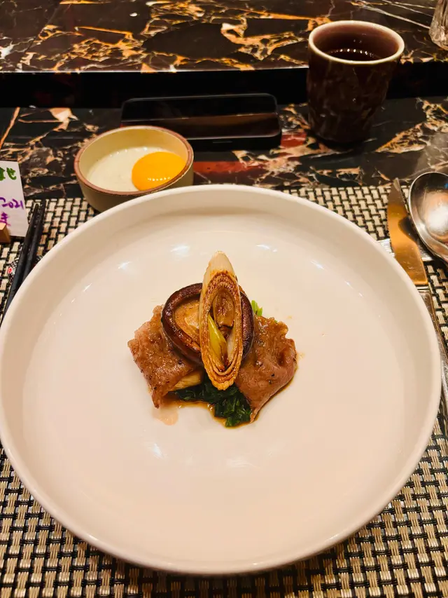 🥩 宮崎和牛薄燒|油花分布均勻,烤五分熟啱啱好,入口多汁油香四溢,配壽喜燒醬汁和生蛋黃,口感超濃郁✨
