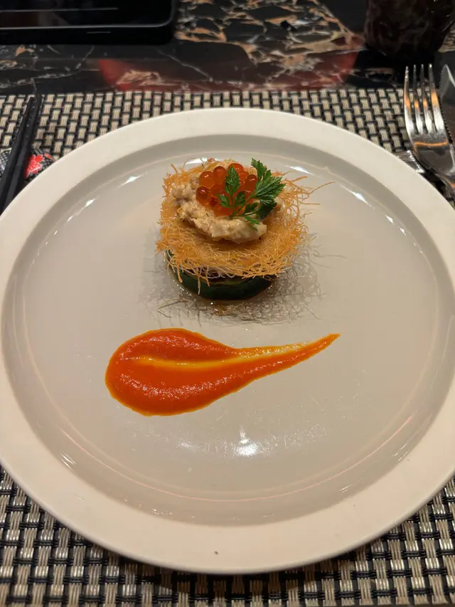 🦪 北海道扇貝|厚實鮮甜,搭配炸玉米須、三文魚籽和烤西葫蘆,旁邊點綴日式番茄醬,層次豐富✨