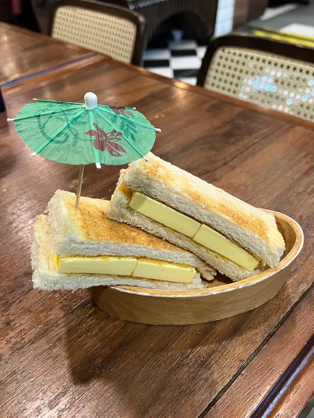 多士烘得都幾脆口,然後有好大塊牛油同好多咖央醬,好邪惡但好食!!😋同埋佢有把細個食啫喱糖嘅紙遮仔,超有回憶😆