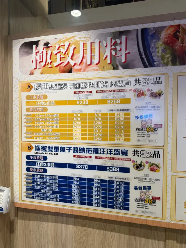 兩大放題套餐包括A set 經典套餐晚市$258起 及 B set 極緻套餐$398起,A餐就已經有82款食品,仲有大量前菜、熟食、飲品、生啤、清酒、雪糕、水果、甜品,全部都係任飲任食,質量同性價比絶對有驚喜