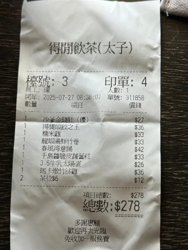 食咗八樣嘢埋單$270,呢個價錢同今日係星期日,真係好扺 扺食。暫時覺得唔係所有點心都出色,整體合格有餘,下次試吓其他。