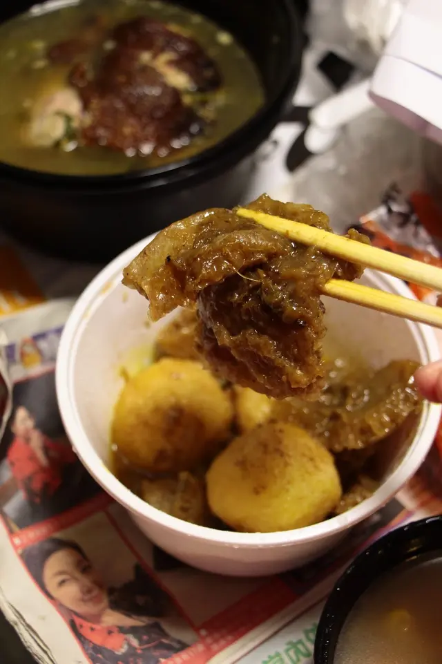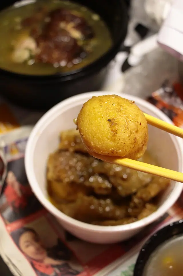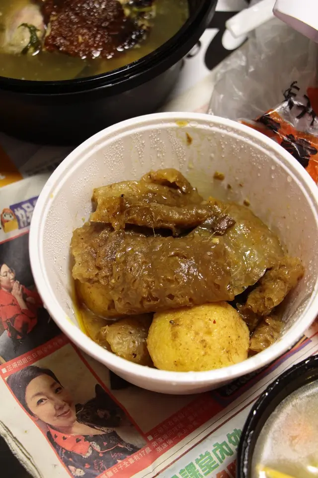 除咗外賣飯, 得龍亦都買埋特大炸魚蛋同埋豬皮, 可以揀沙嗲或者咖哩汁, 炸魚蛋爽口彈牙非常, 最重要係自家製咖哩醬炒得香口, 秘製十幾廿樣香料調配而成, 卻又不會過咸, 當豬皮索曬啲汁之後 , 食到停唔到口 。