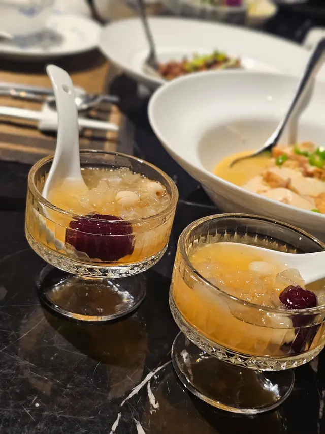 甜品:青棵餅外脆內軟,帶淡淡香氣;雪耳紅棗糖水清潤滋補,完美