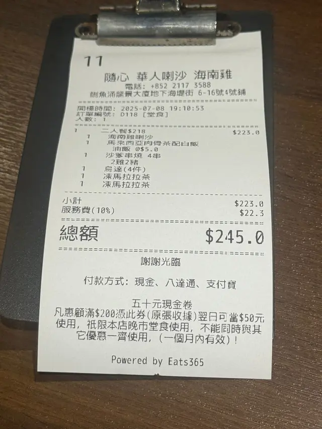 呢間鰂魚涌嘅星馬菜店,出菜快,招牌 海南雞絕對係必食之選,水準非常高。肉骨茶湯底合格但肉質需要改善。喇沙湯底溫和易入口,豆卜吸湯係亮點,麵條普通但湯底扳回分數。如果想試地道星馬風味,海南雞飯係穩陣又出色嘅選擇,其他菜式則有進步空間。路過鰂魚涌想食海南雞,呢度值得一試!