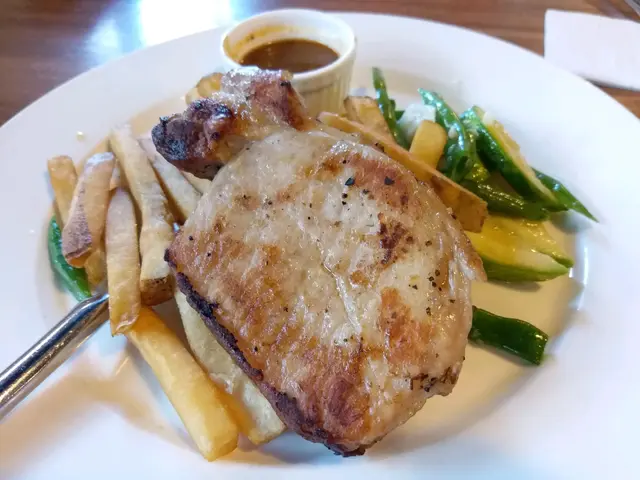 "美國豬肉眼朳"~ 雖然好厚, 但肉質一D 都唔"鞋", 煎得勁香, 出奇地滑, 一切就開, 再配芥末汁,提升了味蕾