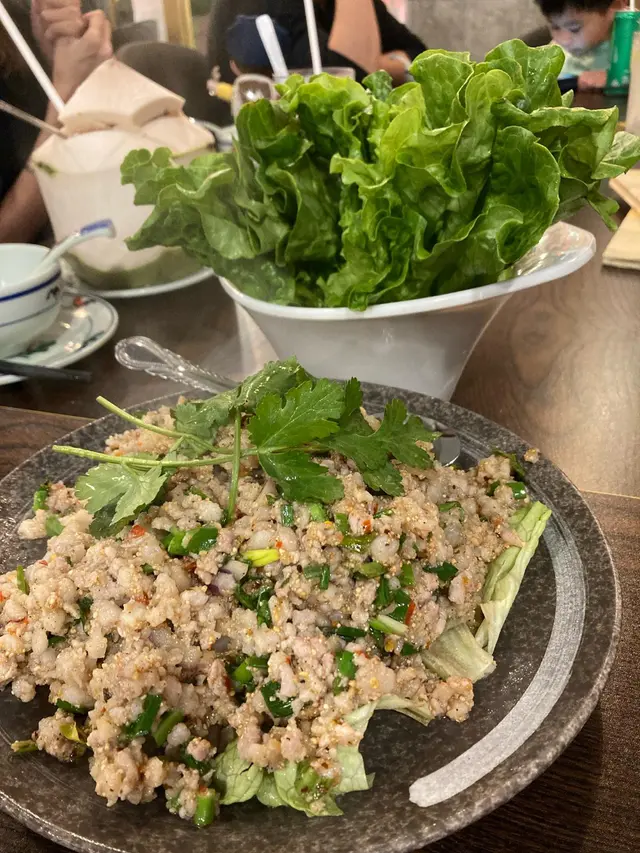 唔係普通肉碎!**野山椒+金不換+檸檬葉三鬼拍門**,爆炒到肉粒乾身帶焦邊,包埋新鮮生菜——**脆!辣!爽!三連擊!** 阿泰姐偷偷講:「落單要叫『小辣x2』,先係泰國夜市級數!」食完個嘴麻到似接吻魚~