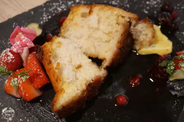 賣相好似心太軟, 表面烘至焦香, 淋上左薄薄微酸帶甜果jam, 內裡為鬆軟麵包,