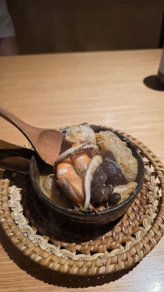 「黑門令保仔龍蝦海鮮煮」以龍蝦頭熬出金黃湯底,濃郁程度可掛勺!湯中臥著半隻爆膏龍蝦+兩隻虎蝦,鮮味直衝天靈蓋🦞
