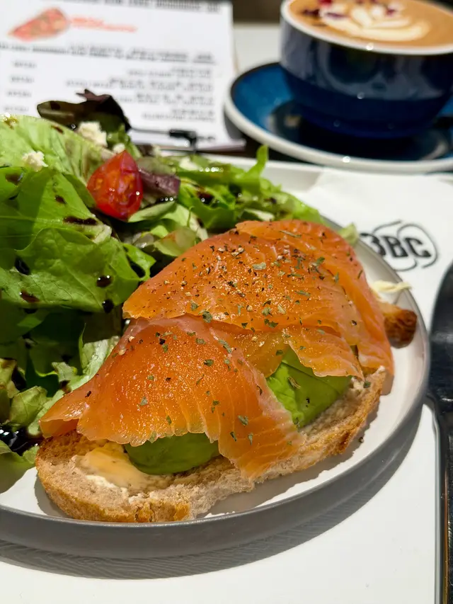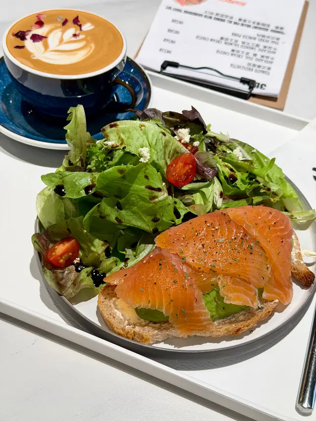 酸種麵包外脆內軟,配上滑嫩牛油果、鹹香煙三文魚與濃郁忌廉芝士,層次豐富,賣相吸睛。