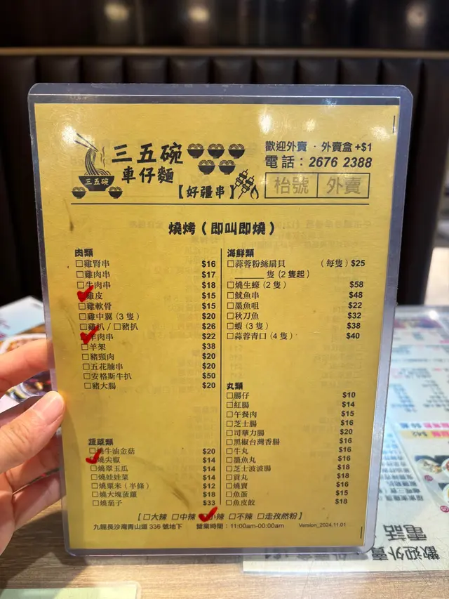 點左4款串燒+ 雞煲,其實又想食招牌車仔麵。於是就叫左「一隻雞份量」 的小辣雞煲,再加多碗 招牌胡辣車仔麵。