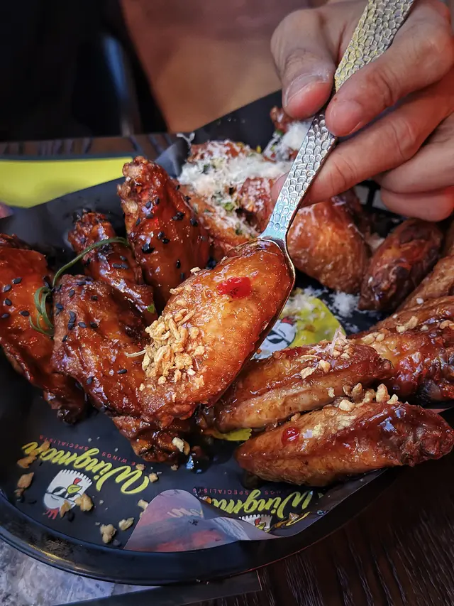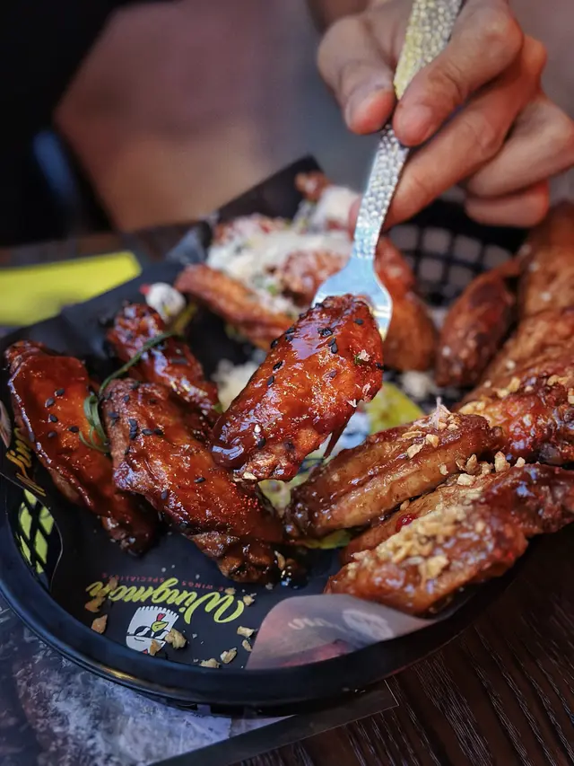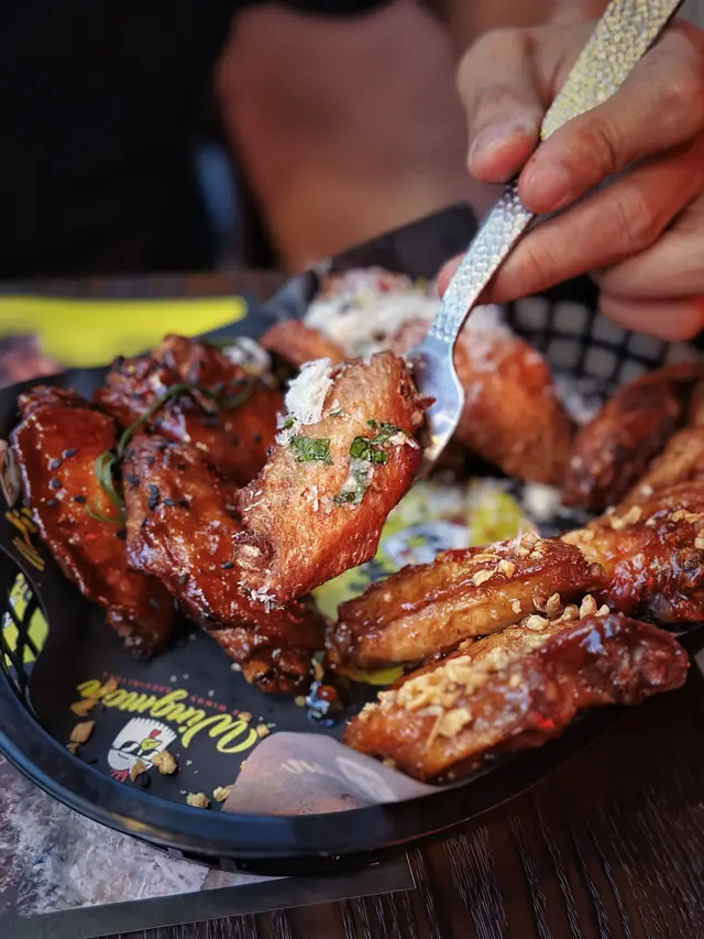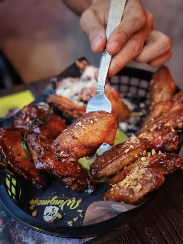 - 泰式甜辣醬:雞翼上塗了泰式甜辣醬,甜甜酸酸辣辣的,很下飯。