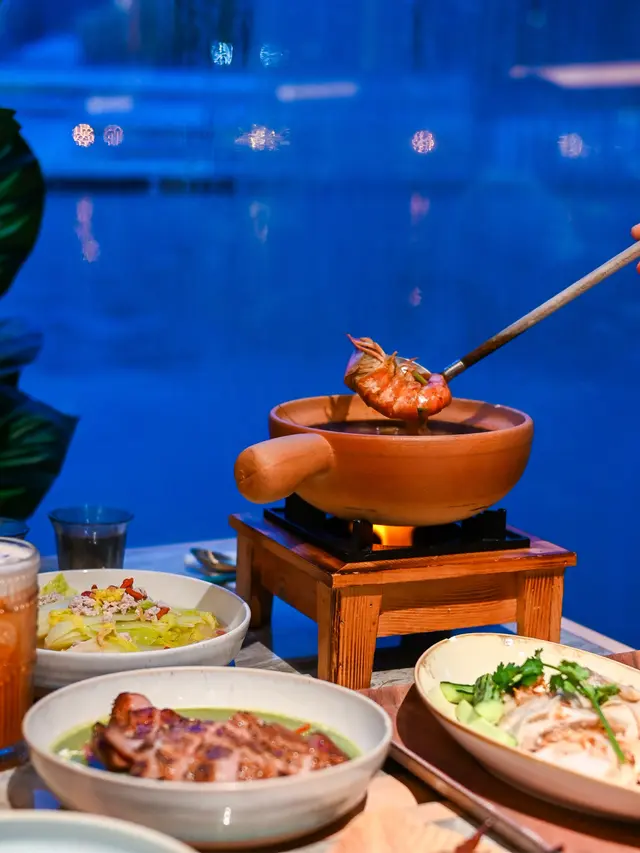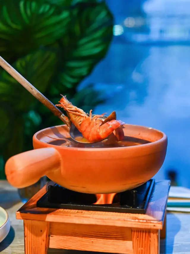 椰香濃郁的冬蔭功湯 盛於古樸瓦煲 經明火慢燉 熱氣氤氳 冬蔭功湯酸辣交織的滋味 啖啖暖胃 與窗外綿綿陰雨的濕涼形成鮮明對比 令人倍感溫暖與幸福🥰