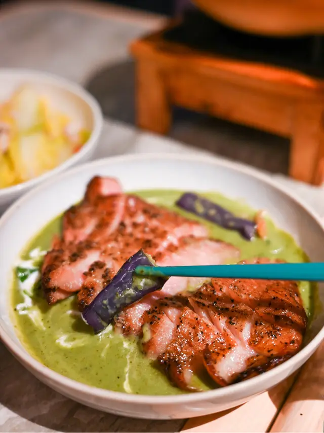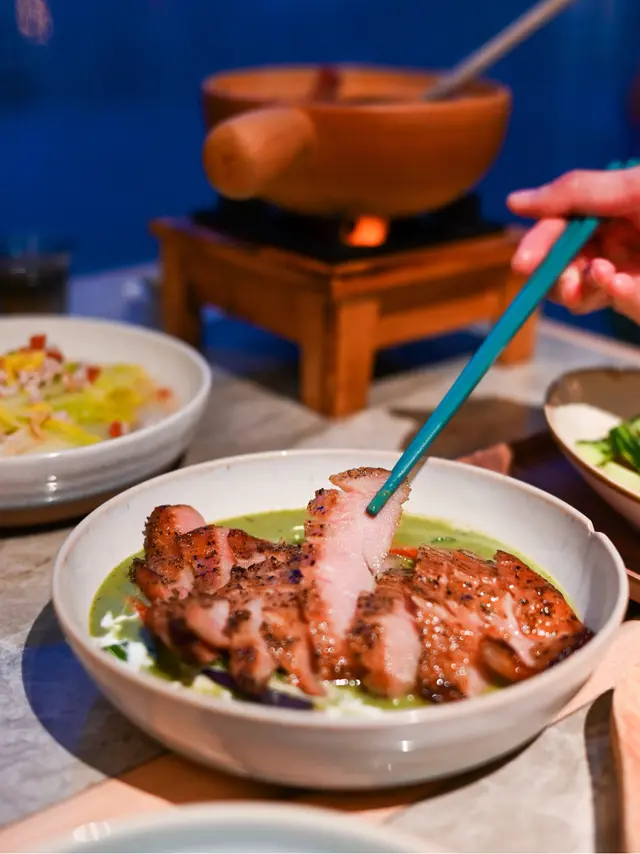 青咖喱濃香撲鼻 絲滑椰汁 巧妙中和青咖喱的辛辣 帶來溫和微辣的豐富滋味 搭配外焦內嫩的豬頸肉 口感層次鮮明 特色盡顯~