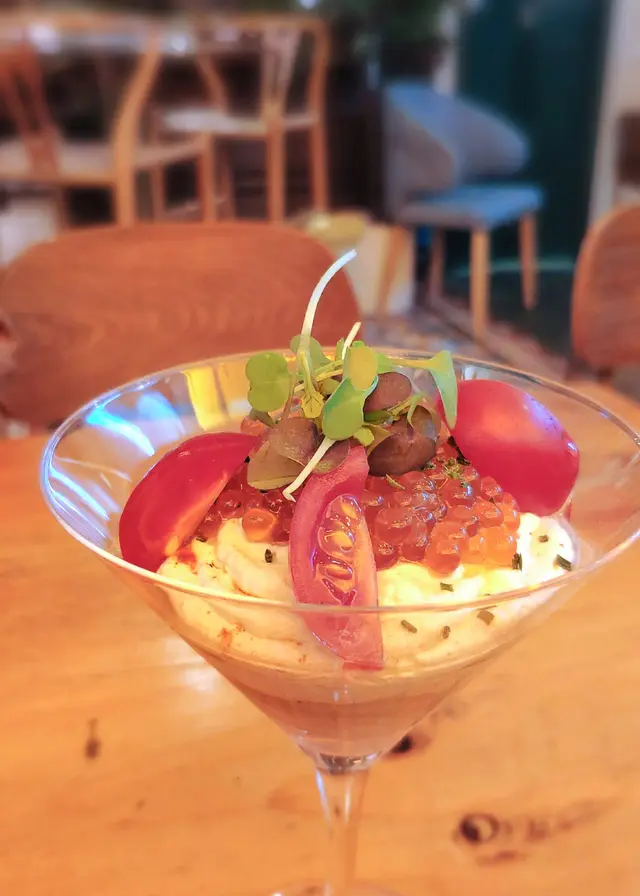 擺盤好靚!以Cocktail杯層層疊形式,最上一層係帶子及魚子