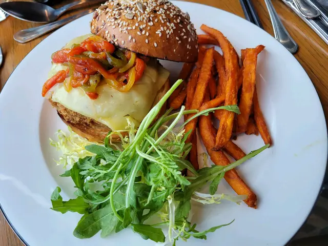磨菇芝麻漢堡搭油浸甜椒和雜菜沙律配蛋王醬,此款是素食菜式,漢堡份量、材料十足,甜椒口感像炸薯,對素食者來說十分貼心,讚