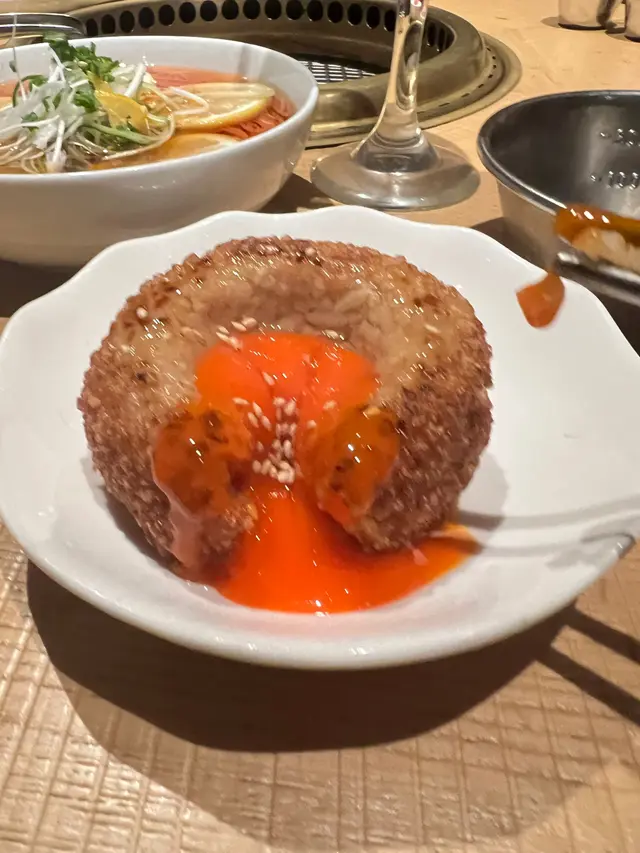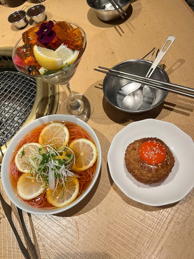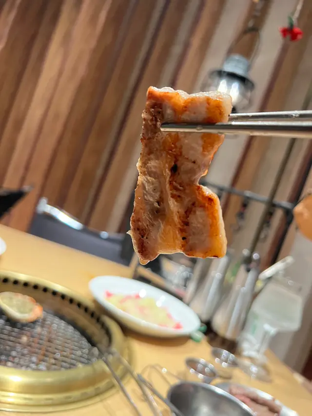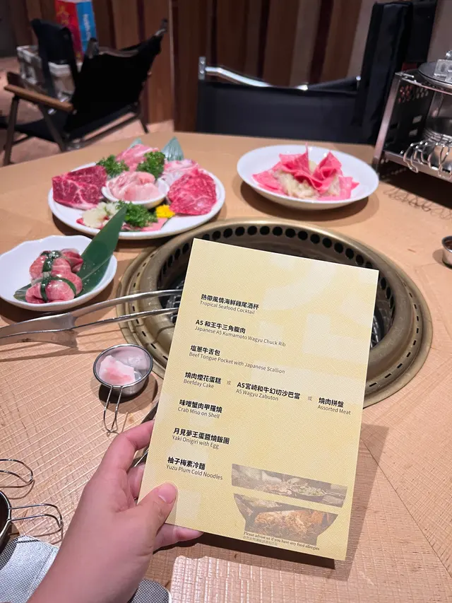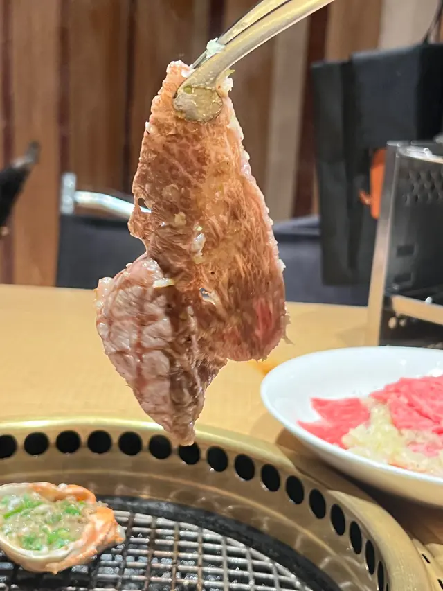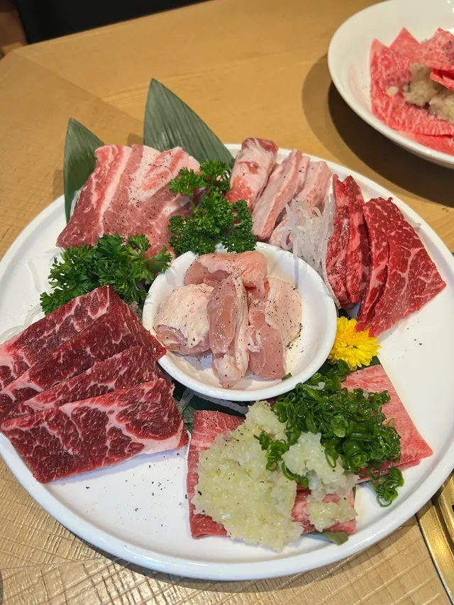 必試A5和王牛三角腹肉🐄 油花分布均勻如雪花,烤至微焦後入口即化,肉香濃郁帶著奶香,質感絕佳;🐷🐣🐮燒肉拼盤更是聚餐福音,齊集雞、豬、牛三款肉品:雞肉嫩彈多汁、豬肉脂香豐厚、牛肉軟嫩帶嚼勁,一次滿足不同喜好,搭配自調醬料風味更豐富🉐
