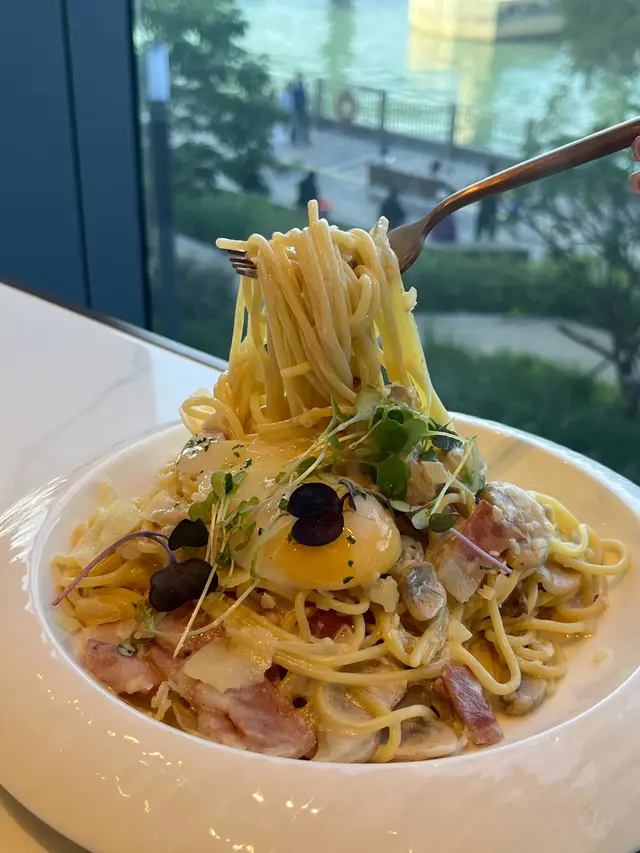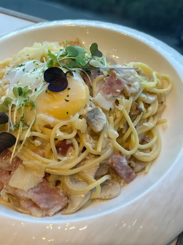 高質!醬汁夠Creamy,掛滿每條意粉,撈勻流心嘅溫泉蛋之後,口感更加香滑🤤