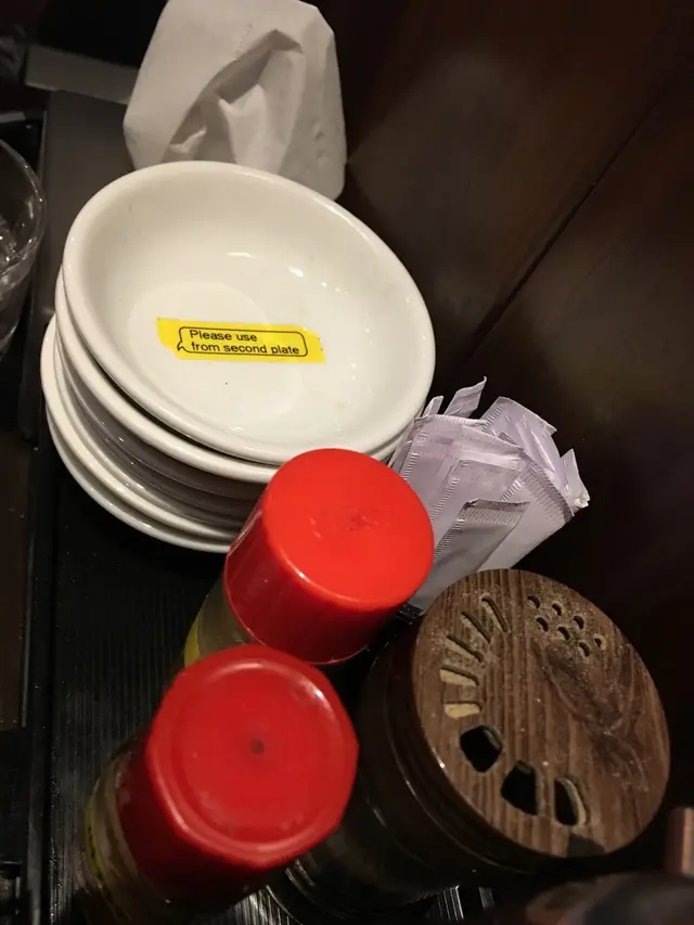 枱面上見到這個,一向有潔癖的我為這家店加了很多分,這個小小的黃色提示顧客不要使用第一隻碟,實在窩心 (雖然就算不提我也會這樣做)。