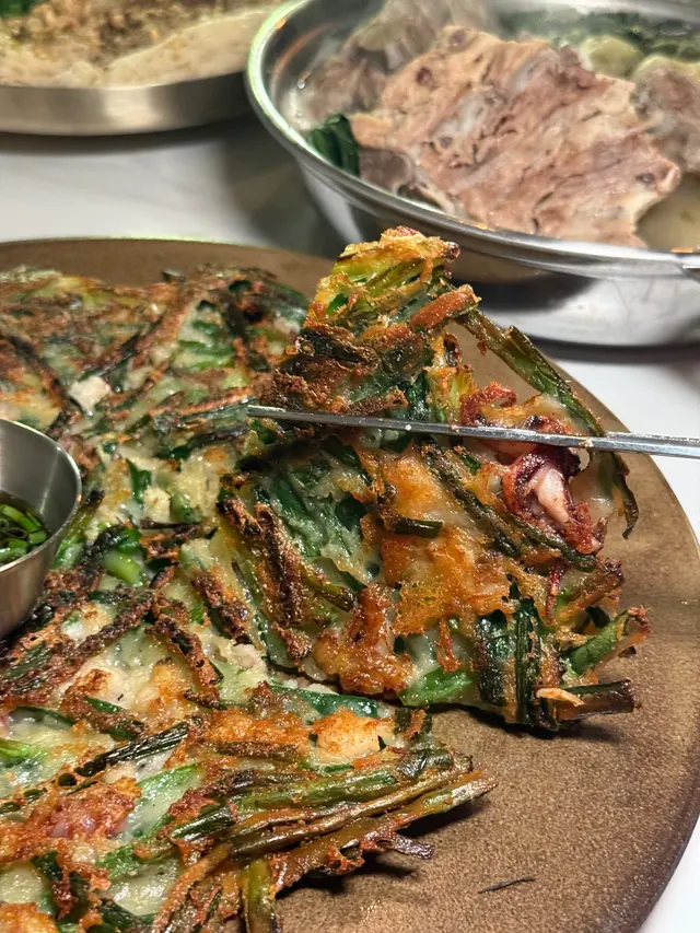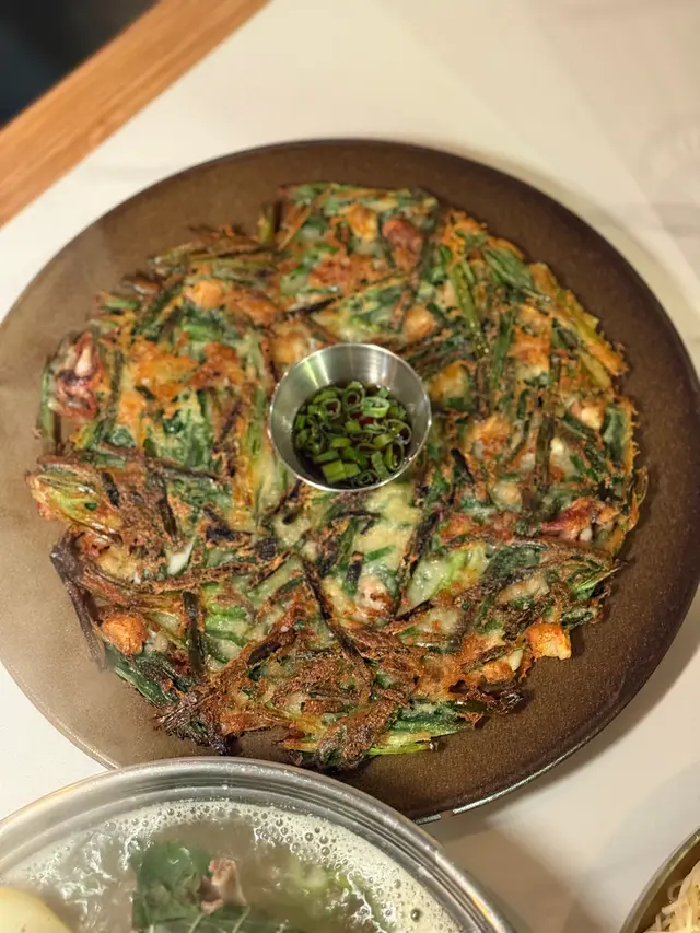 韭菜香濃,煎餅邊緣煎到焦脆,內裏軟糯,搭配魷魚等海鮮,不過就油咗啲