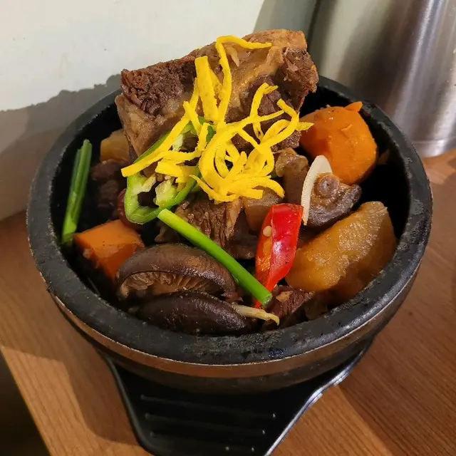 不愧是韓國菜主打的韓式牛肋骨,韓式牛肋骨色香味俱全,每塊牛肋骨個頭都跟女生的拳頭一樣大,用筷子輕輕一剝骨肉分離,柔軟的肉塊吸收到蔬菜熬煮後釋出的湯汁,大口咬下就是爽,韓式牛肋骨肉質軟嫩,肉汁豐沛,蘿蔔入味,味道溫和。