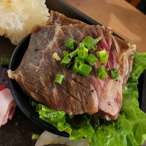 整條厚切的調味牛肋骨一放上烤爐,馬上飄散出撲鼻香氣,瞬間滿是肉香,調味牛肋骨烤個兩面微焦,品味到調味牛肋骨焦脆感與脂肪甜味,能大口吃肉的爽快感真的薄肉片無法比擬,調味牛肋骨咬感柔嫩,私心榮登我最愛的牛肉部位。