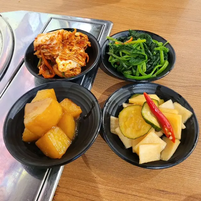 當晚的前菜有泡菜、醃蘿蔔、涼拌菠菜及薯仔,口味上都不錯,尤其是燒肉配泡菜最對味,泡菜嚐起來清爽解膩,感覺可以吃更多肉。涼拌波菜有著獨特的清香,醃蘿蔔酸美開胃,單吃相當過癮,薯仔香甜綿密,頗道地韓國風味。