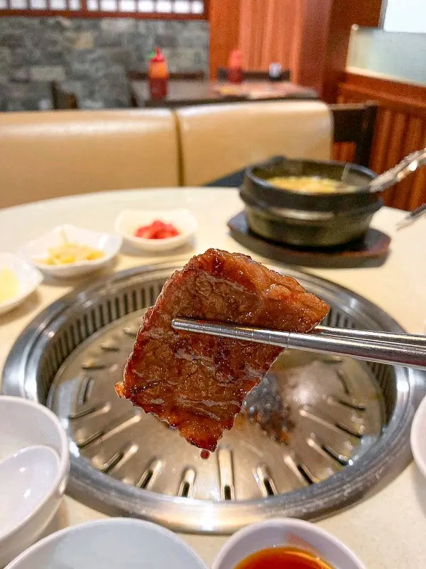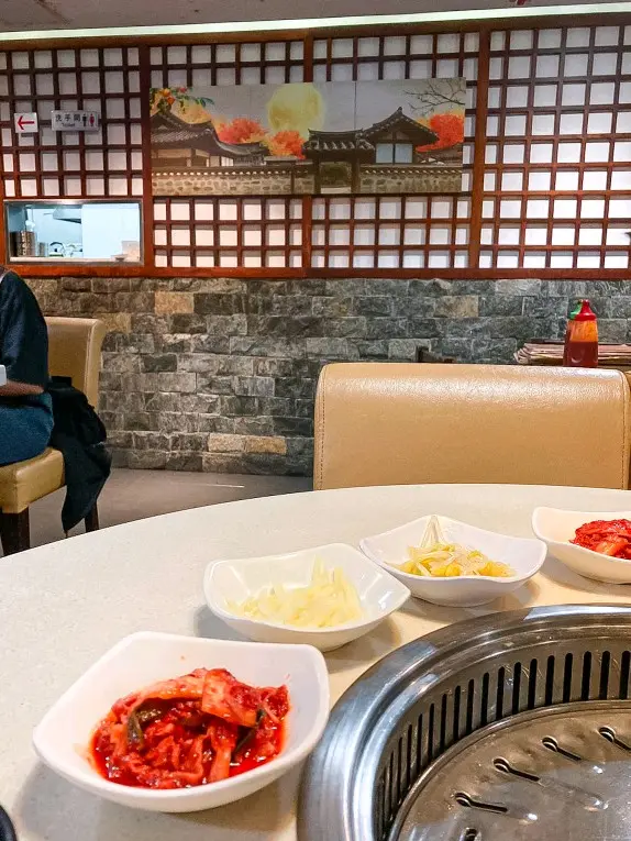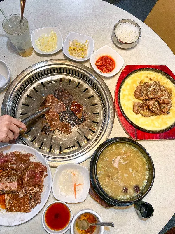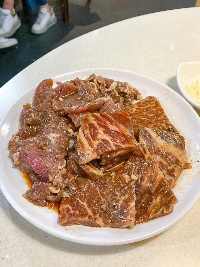 奉送泡菜、豆芽、醃蘿蔔、土豆絲和生菜。所有肉都充分醃製過,其中牛肋骨肉因為有點厚度,最有香氣和口感。不過牛肋骨剛好我們的一份基本上沒有肉😅。以醬油醃製過的肉很容易令烤盤燒焦,不過店員也很細心會幫忙換新的。