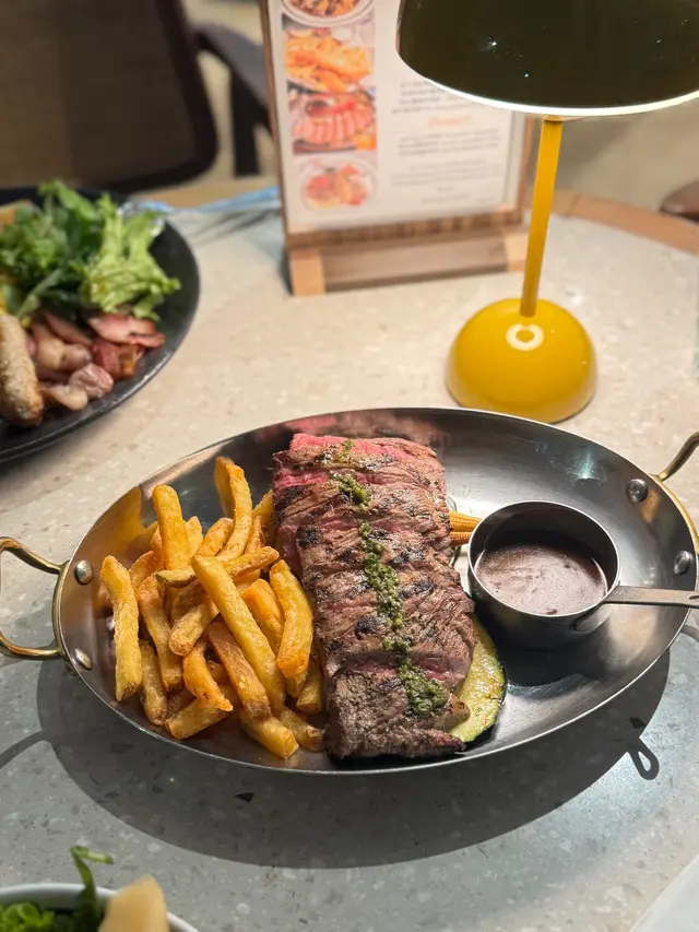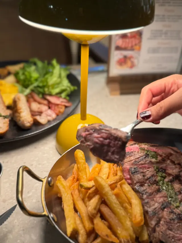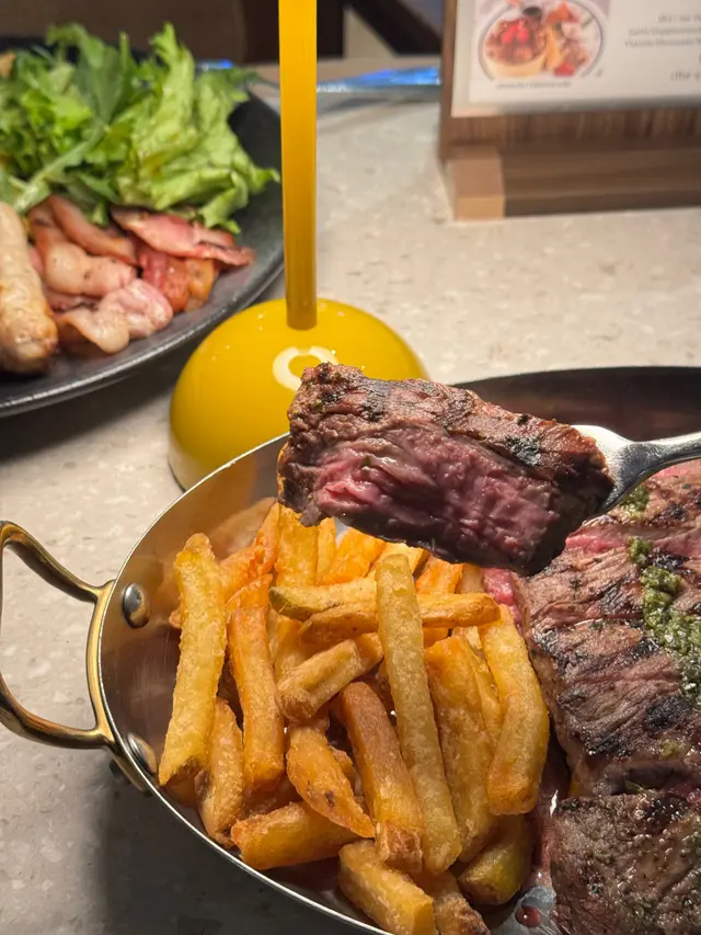牛腩排的肌肉纖維比較粗且長,所以它不像肋眼或西冷那樣入口即化,而是帶有一種令人滿足的、堅實的嚼勁。逆紋切割 是享用牛腩排的關鍵,否則會很難咀嚼。薯條夠曬外脆內軟,蘸上蕃茄汁。