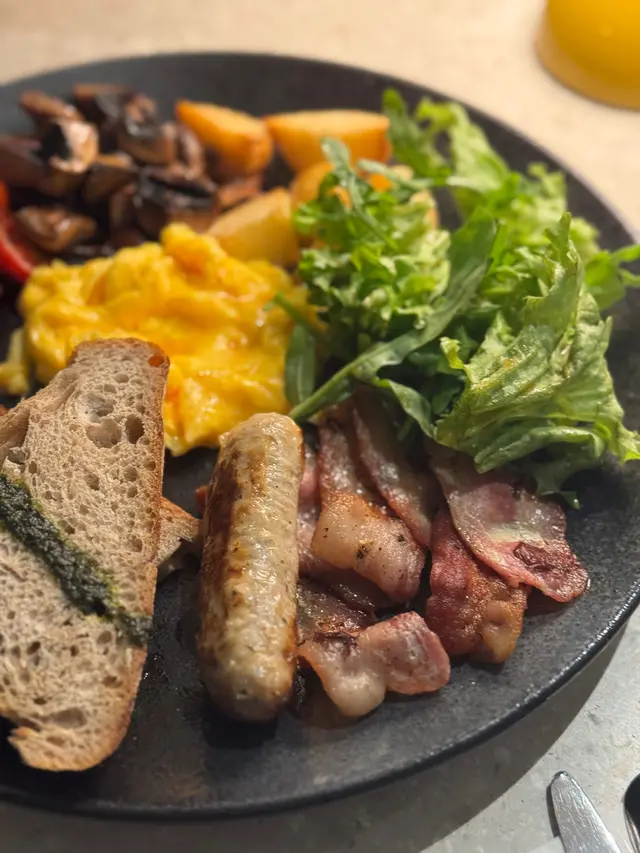 All day brekky :培根: 提供濃郁的煙薰味、咸味和動物脂肪的焦香。煎得脆脆的培根尤其能帶來口感和風味的雙重享受。香腸:通常是豬肉或林肯郡香腸,味道是咸鮮的肉味,帶有香草(如鼠尾草、百里香)的芬芳。炒蛋: 提供濃郁的蛋奶香和黃油香,口感嫩滑。番茄(煎番茄或烤番茄): 經過煎烤後,番茄的酸味變得更加濃縮和溫暖,提供了清新的果酸味,進一步平衡了培根和香氣。蘑菇:用黃油煎炒的蘑菇散髮出濃郁的“Umami”(鮮味),帶有泥土的芬芳和多汁的口感,增加了風味的層次。烤麵包:充滿了黃油的香氣,口感酥脆。它就像一塊“畫布”,可以用來蘸著流心蛋液、焗豆的醬汁或蘑菇的湯汁吃,吸收所有美味的精華。油炸土豆絲帶來的酥脆外皮和柔軟內里,充滿了土豆的澱粉甜香和油炸的滿足感。