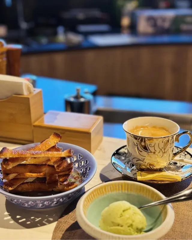 一份燒香糖麵包配開心果雪糕/咖啡,麵包塗抹上牛油、加上不少白糖後燒,甜甜地又有陣陣牛油味,開心果雪糕清甜美味,咖啡澀中帶甘。作為甜品呢個組合相當出色 ✨