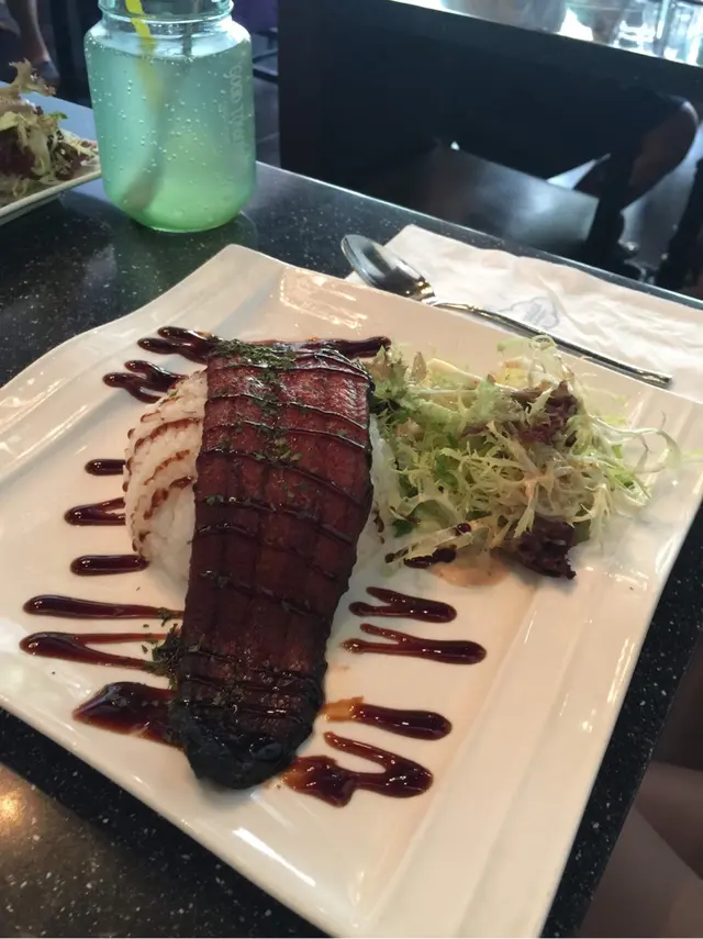 我嘅係一個鰻魚飯。大家睇到啦佢快鰻魚呢系好大塊嘅,我食起上嚟就有啲骨,同埋雖然好深色,好似好咸/好入味咁,但係依然有些少嘅腥味,不過整體來講都係鰻魚常見嘅事黎嘅。整體來講呢,雖然鰻魚好大塊但係好薄,所以我食完飯鰻魚都未食晒啲飯,稍稍覺得有啲到喉唔到肺,差少少咁。佢側邊啲沙律亦都好苦。
