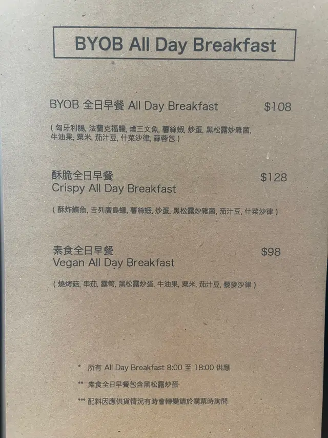 打開餐牌也不用多想,先點了一個素食的All Day Breakfast,配搭是我喜歡的藜麥沙律和牛油果,較驚喜的是露筍,起初沒有太大期望,一般露筍處理還是較乾身,間中吃過起渣,但這裡的卻有給我一點驚喜,碟上的蔬果選材新鮮(露筍、蕃茄、沙律菜、牛油果)處理時也保留了鮮味,惟啡菇和蛋卻有少少overcook了(個人偏好滑身少少)。