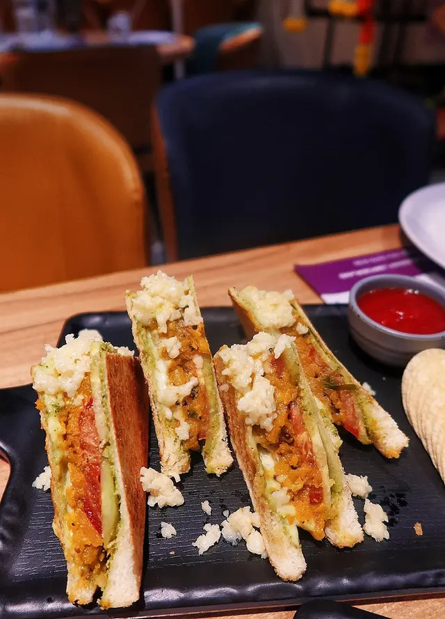 主菜必叫咖哩「Bhagan Masala」,茄子燉至綿密柔滑,與濃郁的番茄咖喱融合,搭配現烤的Garlic & Cheese Naan,餅皮蓬鬆帶焦香,蒜香與芝士份量充足。「Aamchi Mumbai in a grilled sandwich」 以印度街頭風味融入烤製三明治,薯仔蓉口感綿密,非常有特色